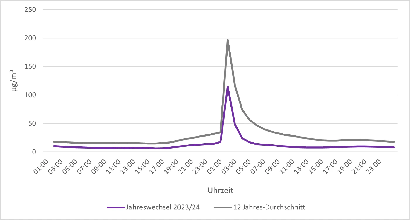 Während des Jahreswechsels 2023/24 normalisierten sich die Feinstaubkonzentrationen bereits weit vor Anbruch des Neujahrstags. Da sich die meisten Silvesterfeiern kurz nach dem Jahreswechsel in Innenräumen abspielen, ist die menschliche Expositionszeit gegenüber erhöhten Feinstaubkonzentrationen grundsätzlich auf einige Minuten bis hin zu wenigen Stunden begrenzt. Da vor allem langfristig hohe Feinstaubkonzentrationen als gesundheitlich problematisch zu bewerten sind, empfiehlt auch das Umweltbundesamt kein Verbot des Silvesterfeuerwerks aus Gründen der Luftreinhaltung.