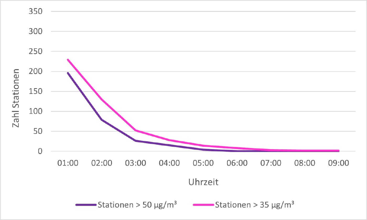 Die Zahl der Stationen mit erhöhten Werten über 50 µg/m³ lag um 01:00 Uhr bei 196 von rund 350 und sank bis um 06:00 Uhr auf null. Mit Ausnahme von nur drei Stationen war gute Luftqualität, hier definiert als Konzentrationen von weniger als 35 µg/m³, bereits eine Stunde später auch flächendeckend wiederhergestellt (s. unten).