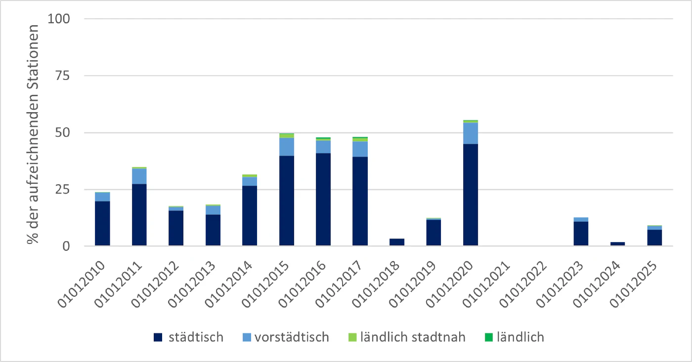 Der Grenzwert für den Tagesdurchschnitt von 50 µg/m³ wurde an 33 Stationen (davon 28 in Bayern oder Baden-Württemberg) überschritten. Bei rund 360 Stationen entspricht dies weniger als 10%. Die an diesen Stationen gemessenen Überschreitungen des Grenzwerts kommen, mit wenigen Ausnahmen, durch die Konzentrationsspitzen in den ersten Stunden des Jahres zustande (s. oben). Eine dauerhafte Überschreitung, über 24 Stunden hinweg, besteht in der Regel nicht. Rund 80% der Stationen mit Überschreitung des Grenzwerts für das Tagesmittel liegen in städtischem Gebiet. Dies zeigt einmal mehr: Feuerwerksfeinstaub ist ein urbanes Phänomen, der ländliche Raum ist so gut wie nicht betroffen (s. Abbildung 2).