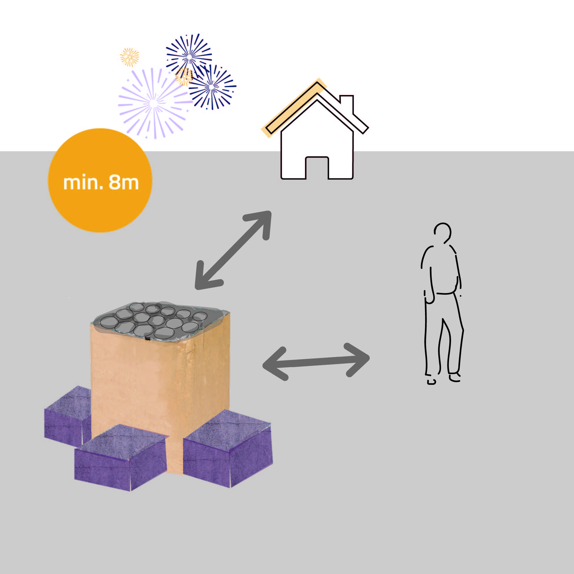Halte einen größtmöglichen Sicherheitsabstand zum Feuerwerk. Der Abstand sollte mindestens acht Meter betragen – mehr ist besser! Zünde Feuerwerk niemals in Menschenmengen an. Nicht nur der Sicherheit wegen: Mit größerem Abstand ist das Feuerwerk schöner zu betrachten.