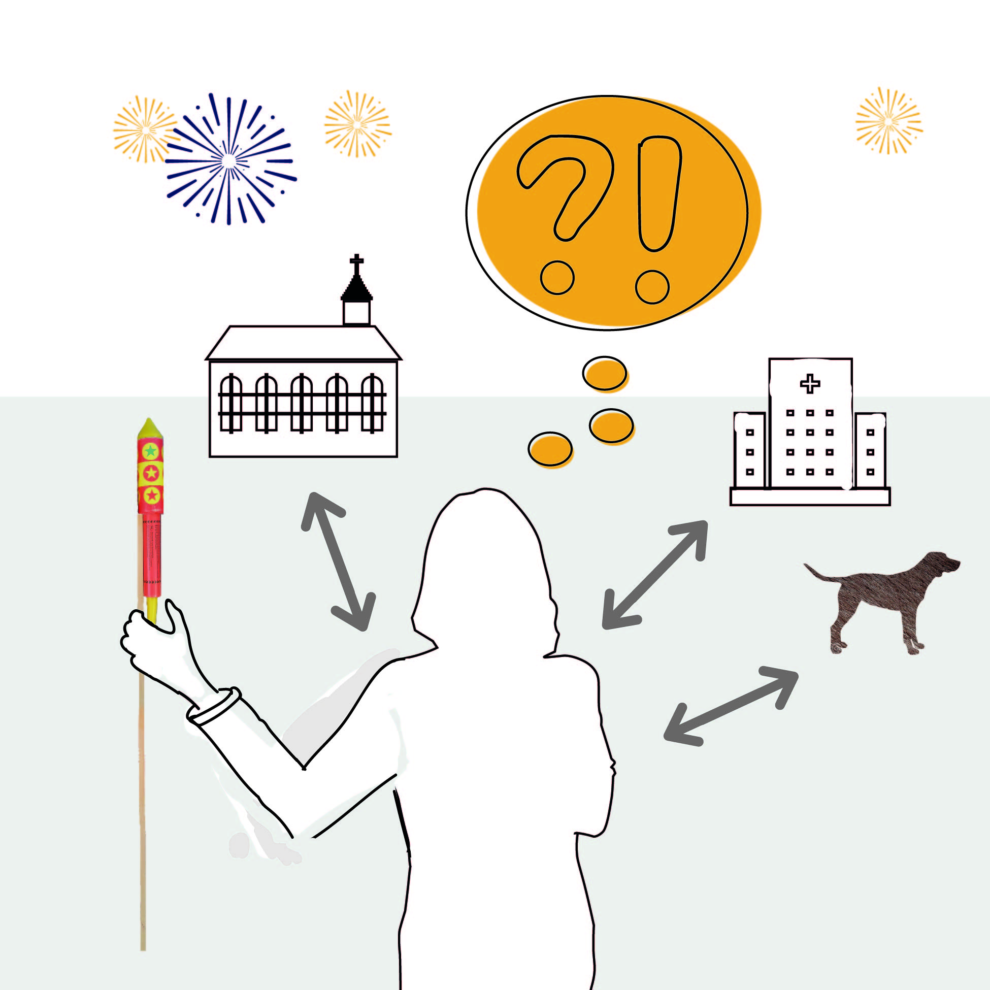 Insbesondere lautes Feuerwerk kann andere an Silvester stören. Prüfe die Besonderheiten deiner Umgebung und zünde kein Feuerwerk in der Nähe von Altenheimen, Tierheimen und Kirchen. Sprich mit den Menschen in deiner Nachbarschaft und kläre sie darüber auf.