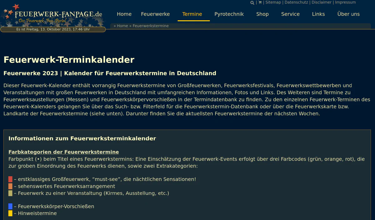 Die Feuerwerk-Fanpage listet vorrangig Feuerwerkstermine von Großfeuerwerken, Feuerwerksfestivals, Feuerwerkswettbewerben und Veranstaltungen mit großen Feuerwerken und kuratiert diese.